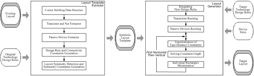 For this method, IPRAIL (Intellectual Property Reuse-based Analog IC Layout) has been developed, where the overview methodology is shown in Figure 1. The symbolic structural template comprises of a set of constraints that govern the connectivities, floorplan, placement topology and matching/symmetry in the input layout. It is also technology independent as technology-related constraint-values are symbolic. To generate the layouts, the template is then updated with new constraint values according to the new technology process design rules and the new device sizes necessary to meet the desired specifications. Solution of these template-constraints can be viewed as a modified symbolic-compaction problem.  This is accomplished by a combination of graph-based shortest path and linear-programming approaches.